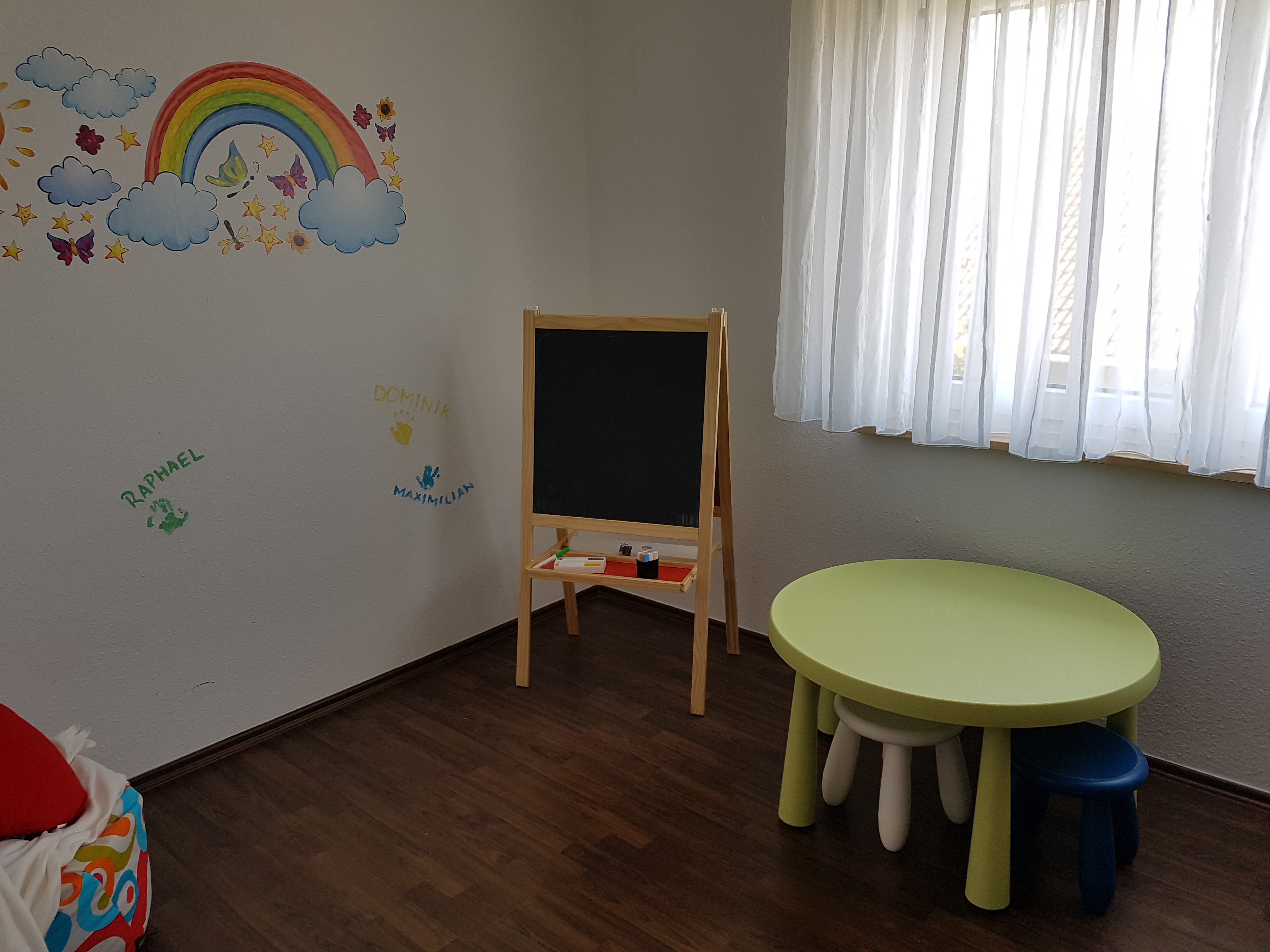 Eine eigene Schlafmöglichkeit für jedes Kind ist vorhanden. Auf dem Grundstück befindet sich ein großer Garten, der teilweise auch als Nutzgarten angelegt ist und der häufig mit den Kindern besucht wird. So können wir z.B. im Sommer Johannisbeeren frisch vom Strauch essen, das Kinderbeet gießen oder Trampolin springen.